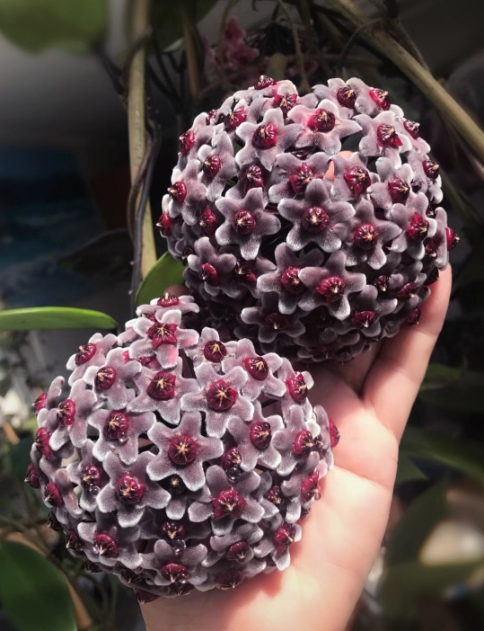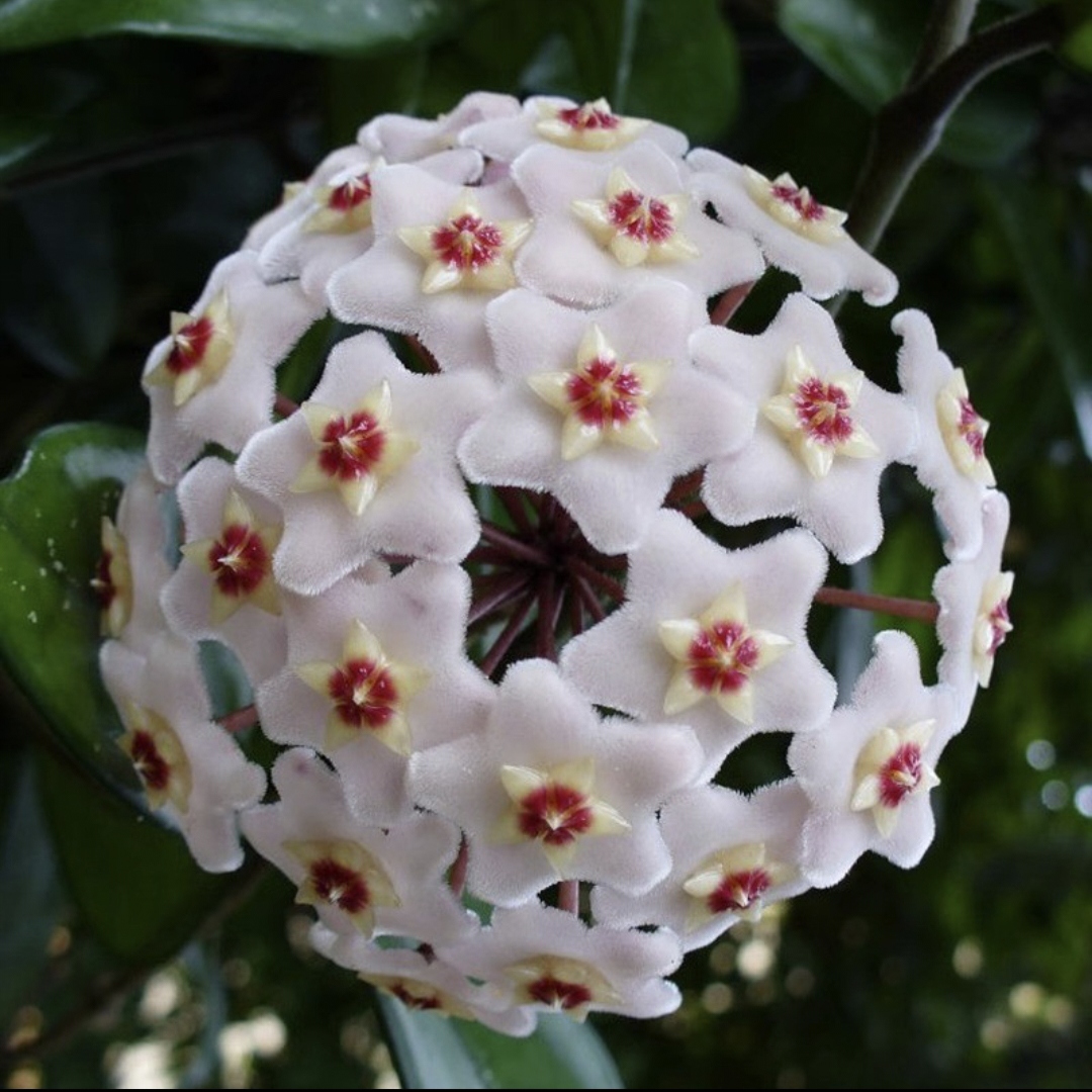 Clusters of Flowers: The highlight of the Hoya carnosa is undoubtedly its clusters of exquisite, waxy flowers. These star-shaped blooms are often referred to as "porcelain flowers" due to their delicate and porcelain-like appearance. The flowers vary in color, ranging from creamy whites to pinks and even deep reds.