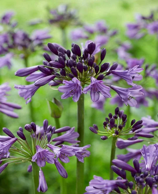 This alluring evergreen perennial produces an elegant display of dark, purple-black buds that open to reveal starry, violet blooms. The domed flower heads perch neatly upon stiff, upright stems above the slender, arching foliage. Agapanthus 'Poppin' Purple' is long lasting and repeat blooming, for an extended flowering period.This exciting new variety is quick growing compared to other varieties. With a neat, compact habit it makes a superb border perennial or patio plant. Height: 60cm (24"). Spread: 45cm (18").
