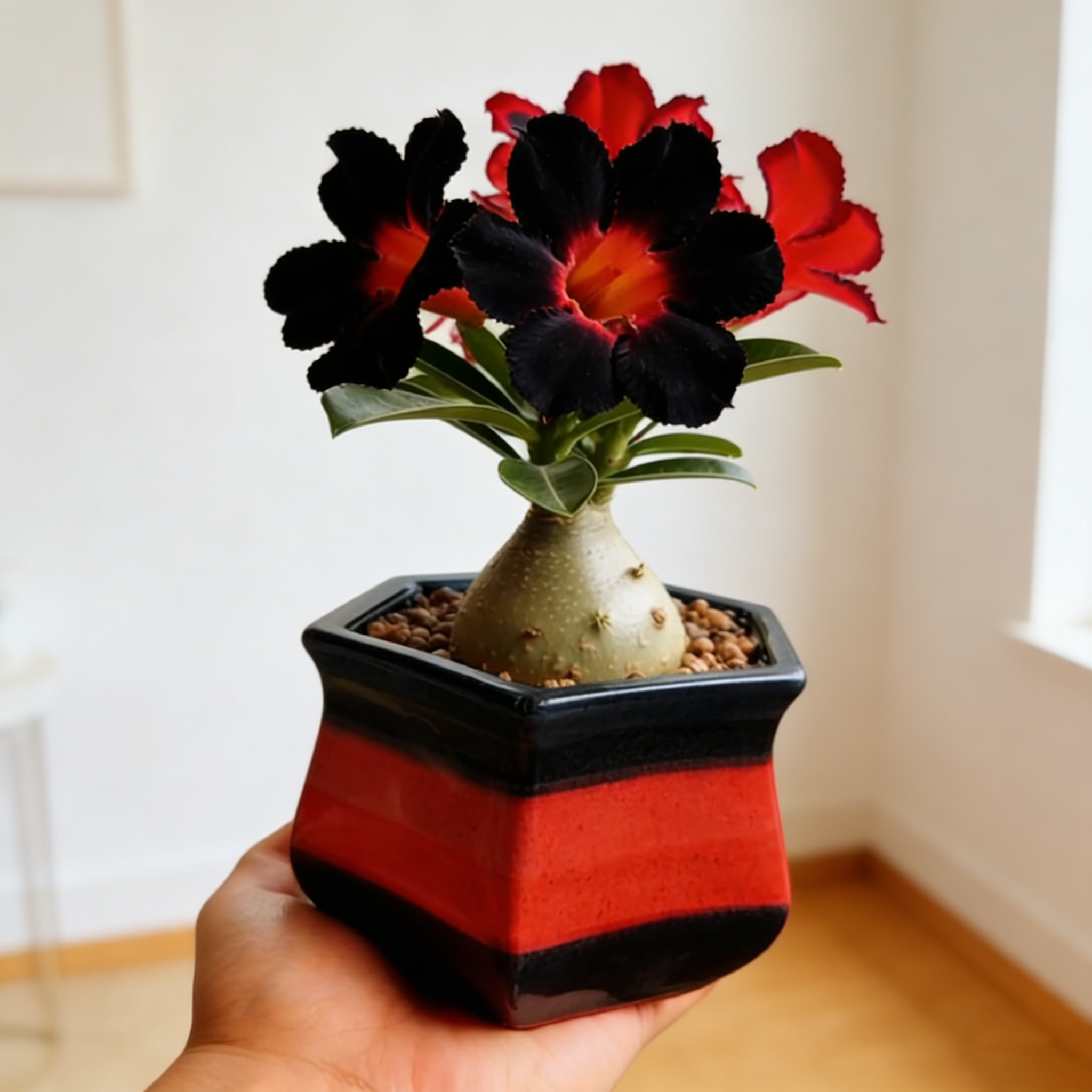 Key Features: 🌸 Colorful Blooms: These captivating Desert Roses flaunt a variety of vivid flower colors, with lush green leaves, perfect for bringing a touch of wonder to any space. 💧 Unique Caudex: Boasts a thick, fleshy caudex that stores water, giving it a distinctive bonsai - like appearance and great drought tolerance. 🌤️ Adaptable Growth: Thrives in sunny to partially sunny conditions. 🌱 Low - Fuss Care: Doesn't demand excessive attention—its beautiful flowers and intriguing form make a statement on their own!