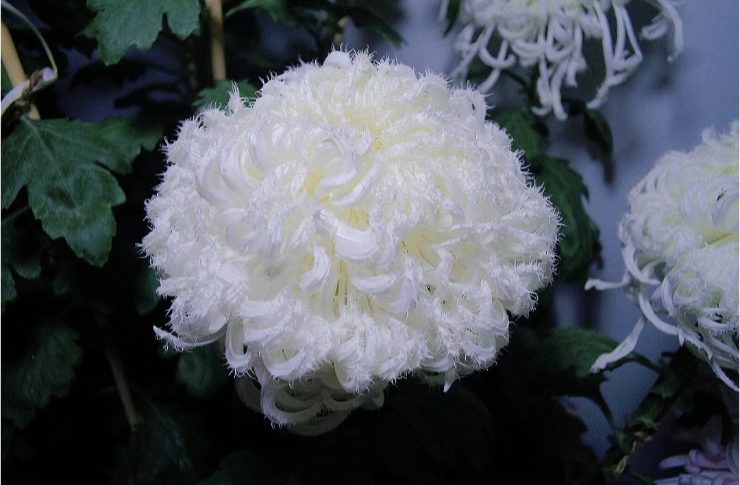 Chrysanthemum or white burr, blooms like a ball of yarn with a very textured texture. White burr is the basic flower type of burr-like chrysanthemums, with white flowers and yellow centers, straight tubes with multiple rounds of petals in tongue-shaped flowers, and flat feet.