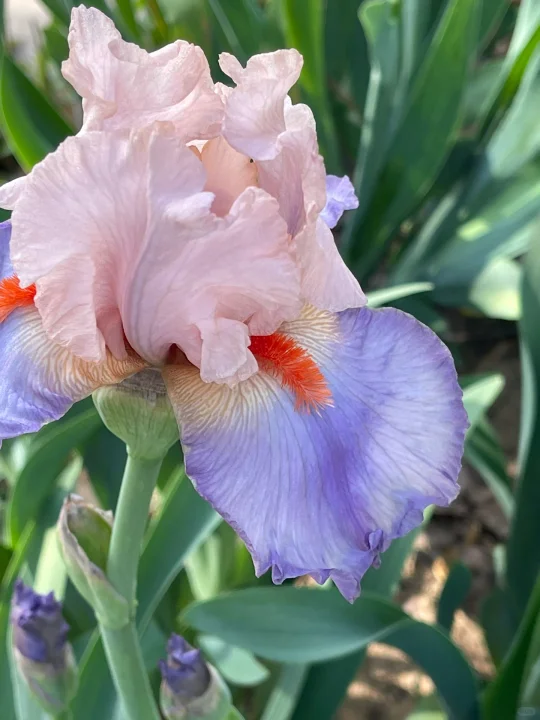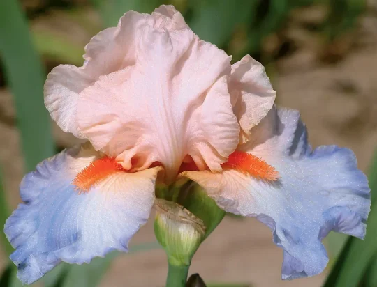 French Cancan's standards are very light pink. The lower petals have a bluish lavender color, while the upper petals surprise with a delicate shade of pink turning into apricot. The upper portions of the light lavender-blue falls are colored with the same light pink, really drawing attention to the prominent bright red/orange beards. Grows to 33 inches tall and blooms mid to late season.